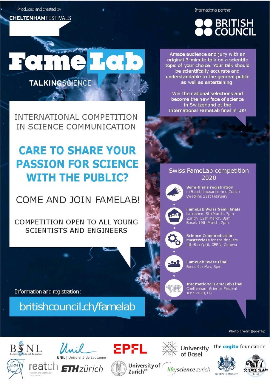 Come and join FameLab 2020, one of the biggest science communication competitions in the world, and become the new face of science in Switzerland! The best participant will have the honor of representing Switzerland at the FameLab International final at the Cheltenham Science Festival in the UK.
